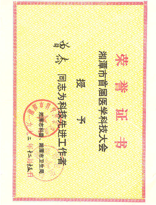 In 1992: Due to the articles on System Medicine and Pharmacology, Awarded Excellent Researcher of Medical Science and Technology for decade, Xiangtan city, China.