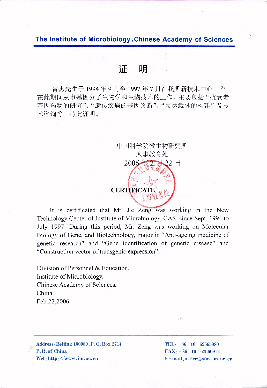 1994- 1997: Assistant Professor, Gene Engineering Technology Center, Institute of Microbiology, CAS, Beijing, PR. China. Beijing Biotech Demo Centre of Beckmann Inc. - Consultant and Advertising Design for Biological Instruments.